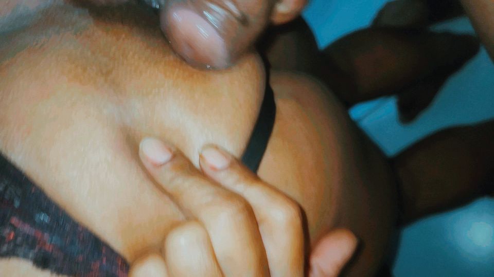in a thong, she moves away and sticks the dick inside her ass
