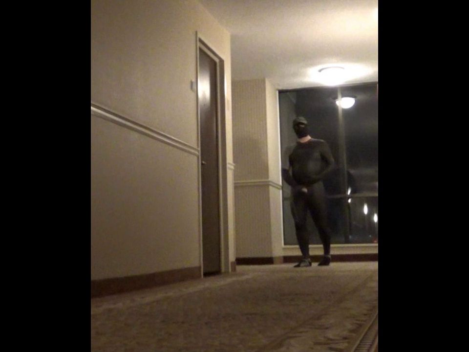 Wearing orca predator wetsuit and mask, risky shooting of cum onto hotel window looking out onto the street.